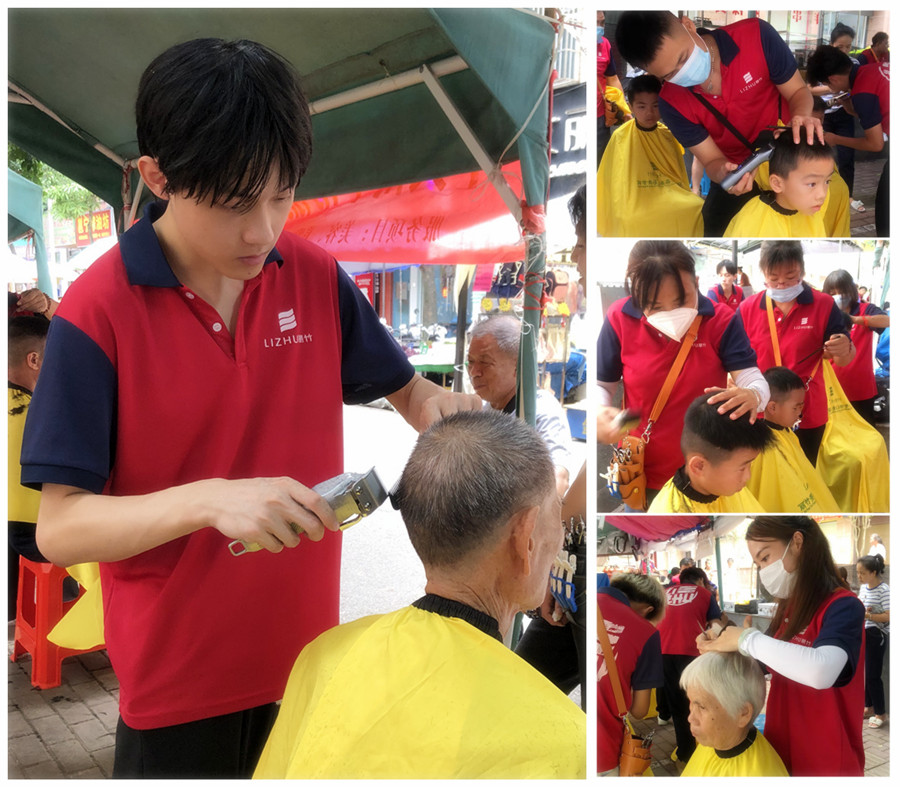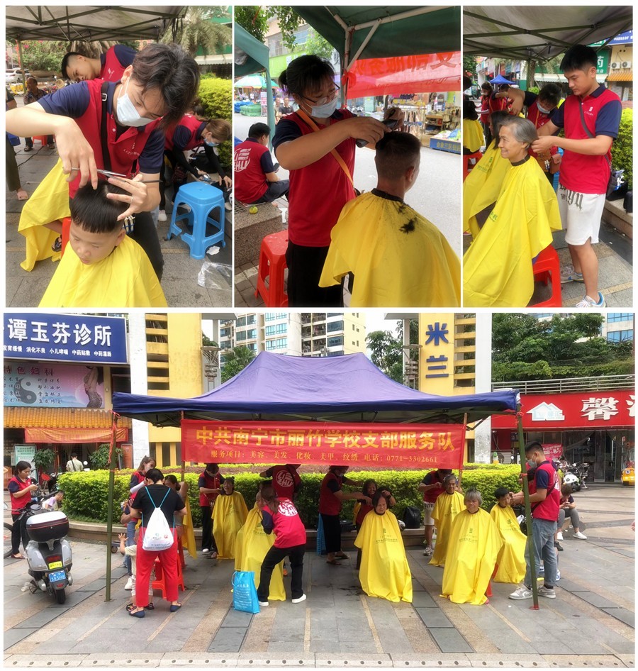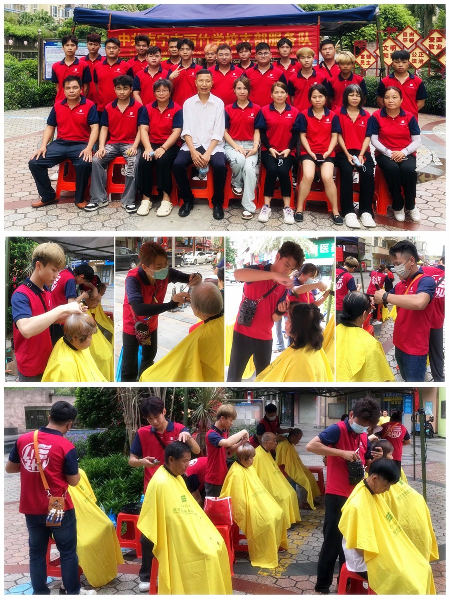 廣西美發(fā)義剪、廣西美發(fā)剪發(fā):隨著氣溫的日益升高,南寧市氣象中心也發(fā)布了高溫預警。面對滾滾襲來的熱浪,廣西美發(fā)剪發(fā)職業(yè)學校(麗竹美發(fā)剪發(fā)職業(yè)學校)的同學們在老師的帶領下,來到各大小區(qū)進行外出教學實踐之余,也為居民送去夏日清涼,免費為大家進行理發(fā)服務。